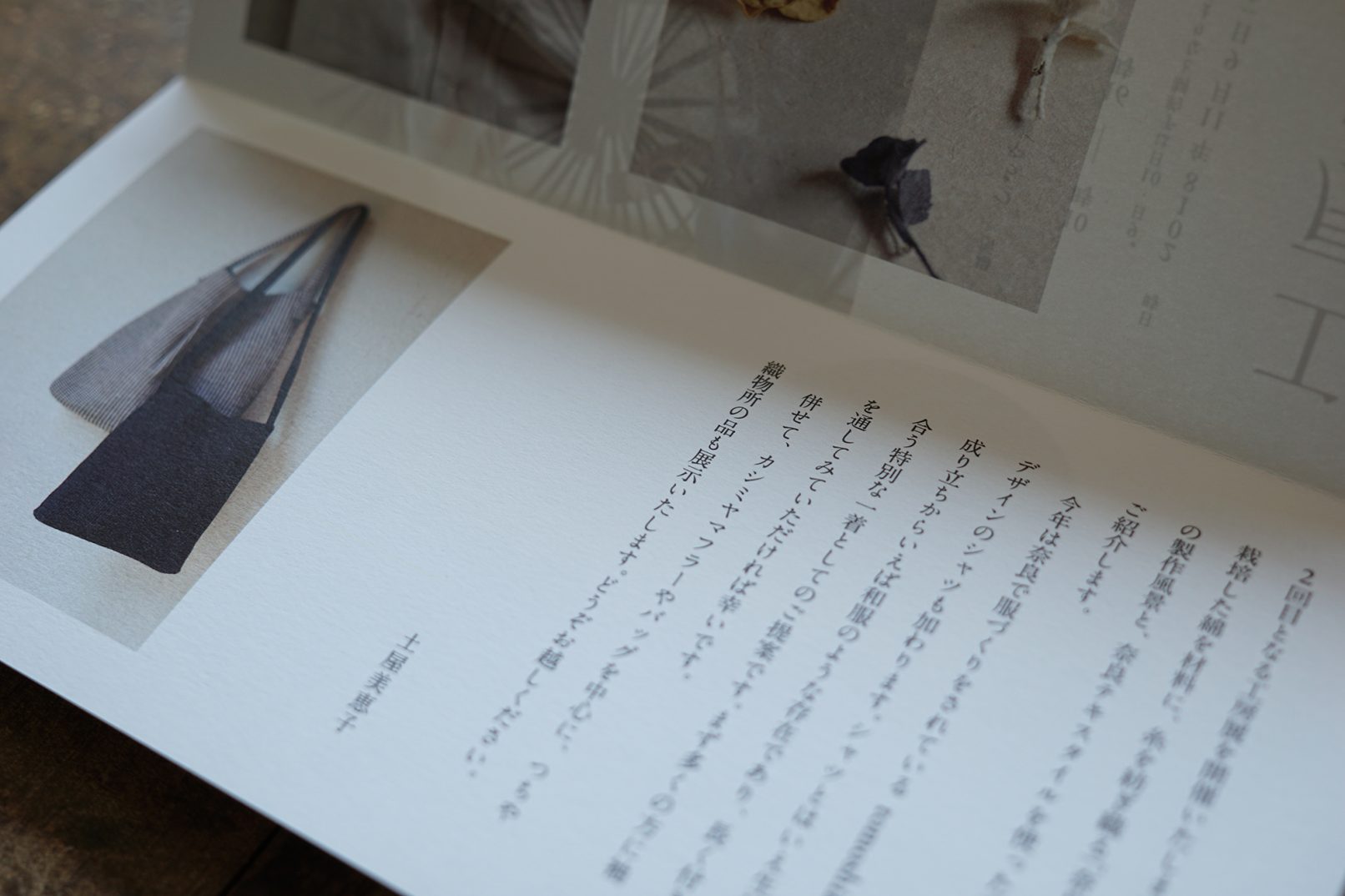 そのため丁寧にじっくりと見ていただくため、「折る(=織る)」作業を加えた6ページのDMを企画し、ひとつひとつに見どころや読みどころを散りばめたデザインを制作しました。